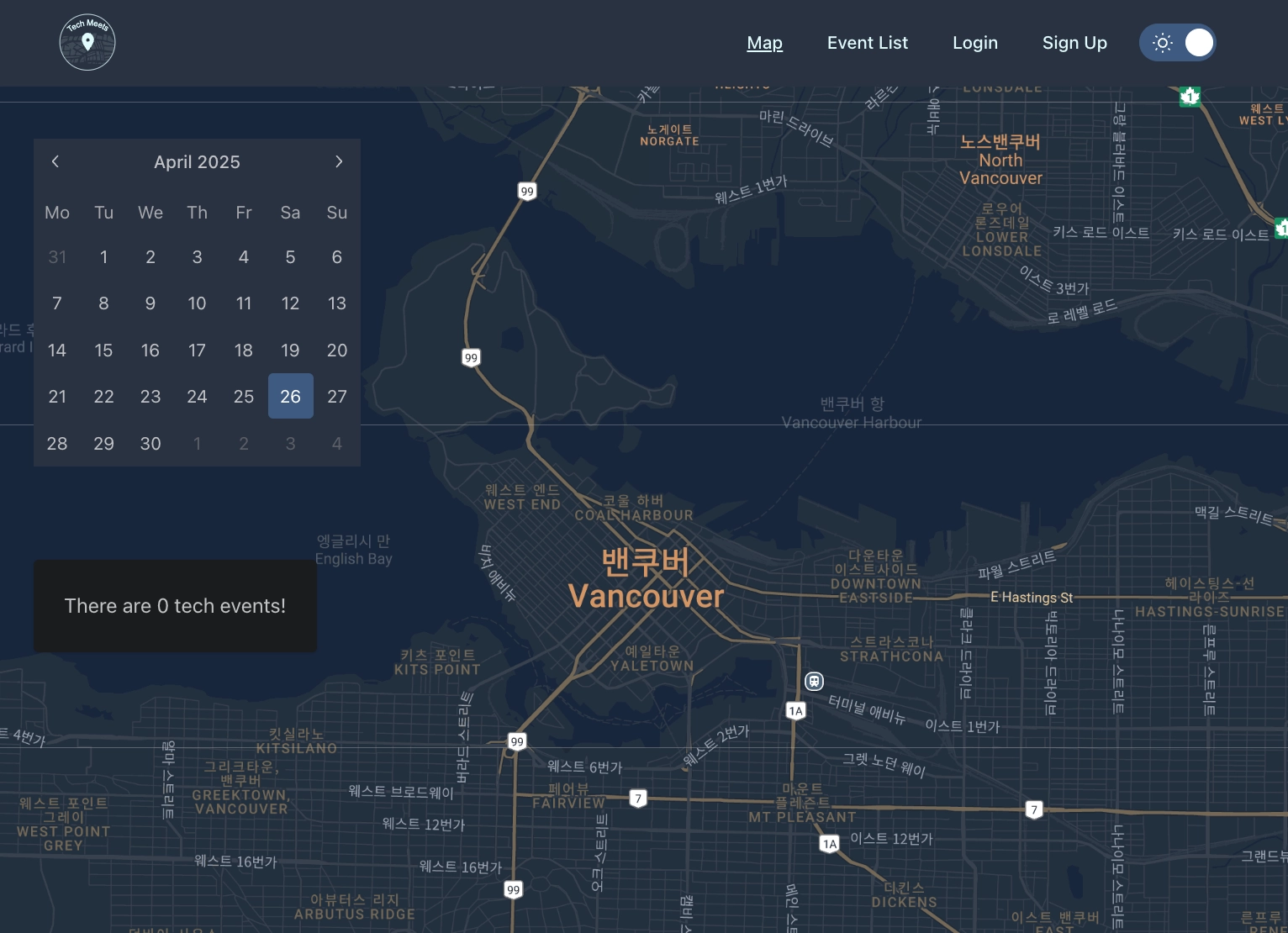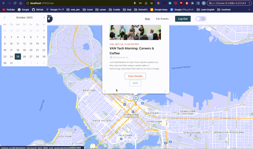 Meetup API로 실시간 이벤트 데이터를 가져오고 Google Maps API로 이벤트 위치를 시각화했습니다.